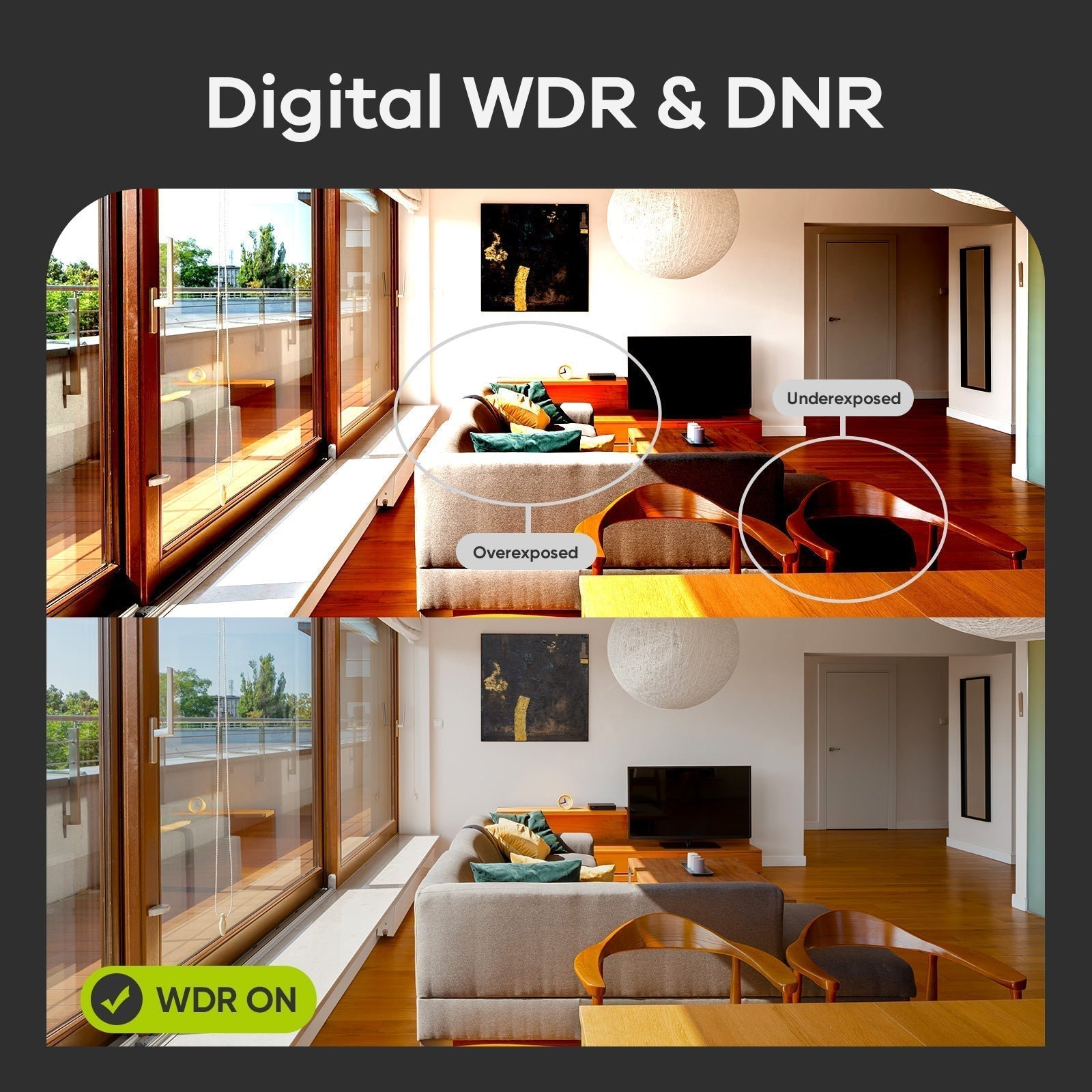 The dynamic range capability enables the outdoor wired camera to cope with complex scenes containing bright and dark objects. With DNR, the camera can shoot sharp images without image noise in darker conditions.